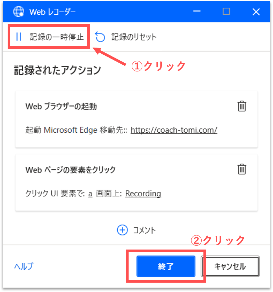ブラウザ上に表示された構造化データを取得するために、一度Webレコーダーを終了させます。「Webレコーダー」パネルの「記録の一時停止」をクリックしてから、「終了」ボタンをクリックします。