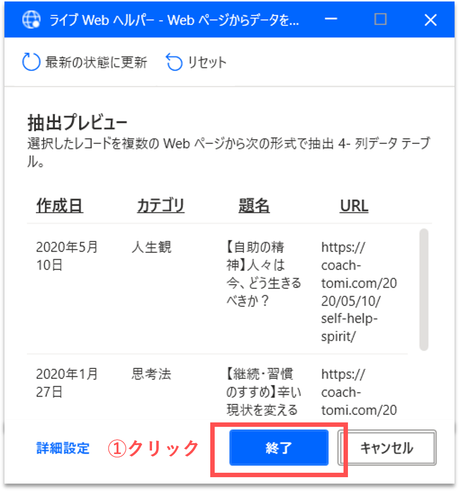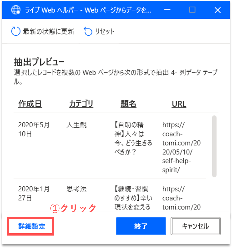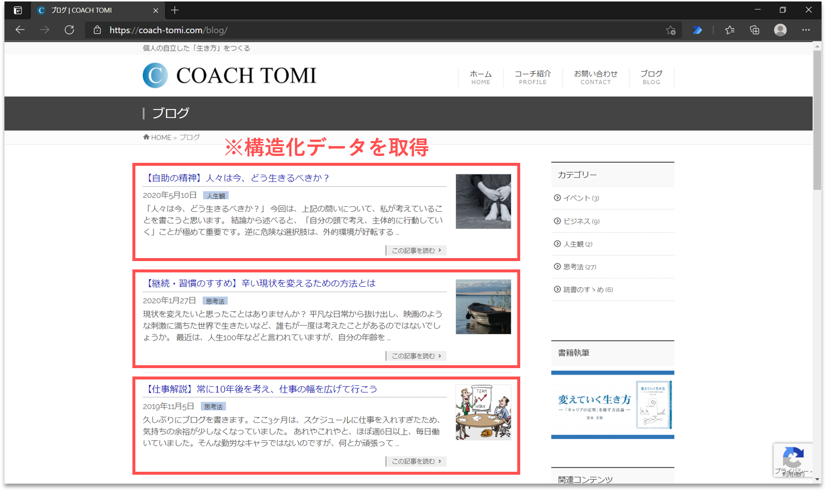 今回は、ブログ記事の見出し情報(構造化データ)の中から、「作成日」、「カテゴリ」、「題名」、「URL」の4項目を取得したいと思います。取得するページの最大数は3とします。