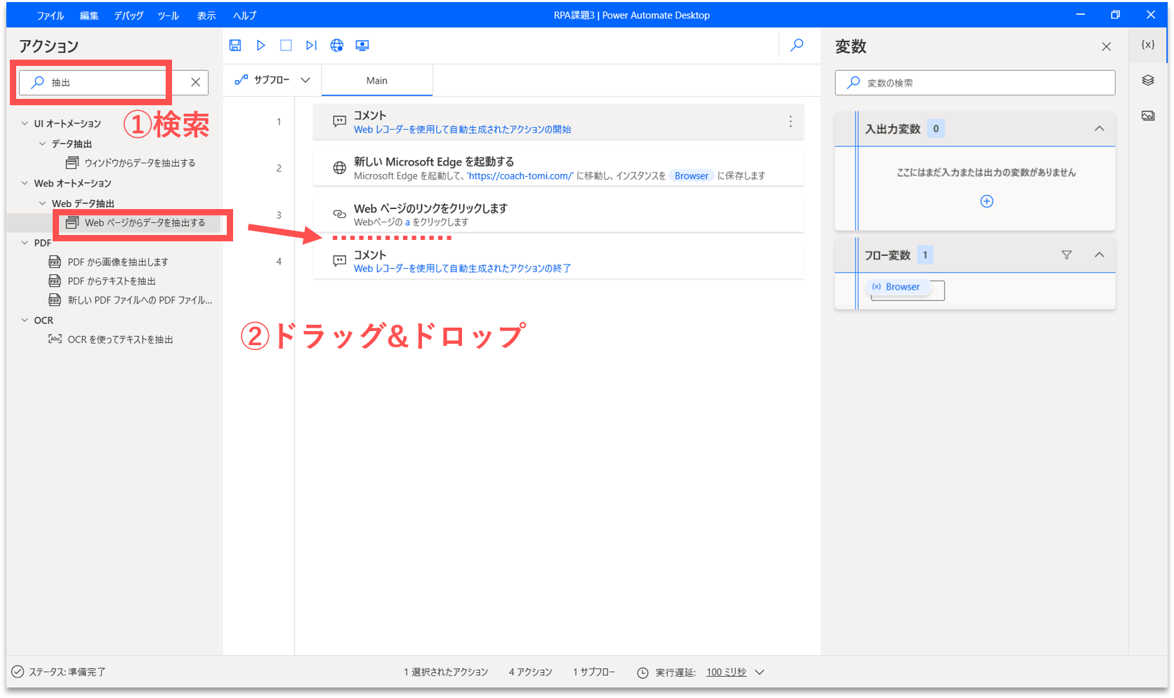 画面左側のアクション検索窓に「抽出」と入力します。「Webページからデータを抽出する」アクションを、フロー内の「Webページのリンクをクリックします」アクションの直下にドラッグ&ドロップします。