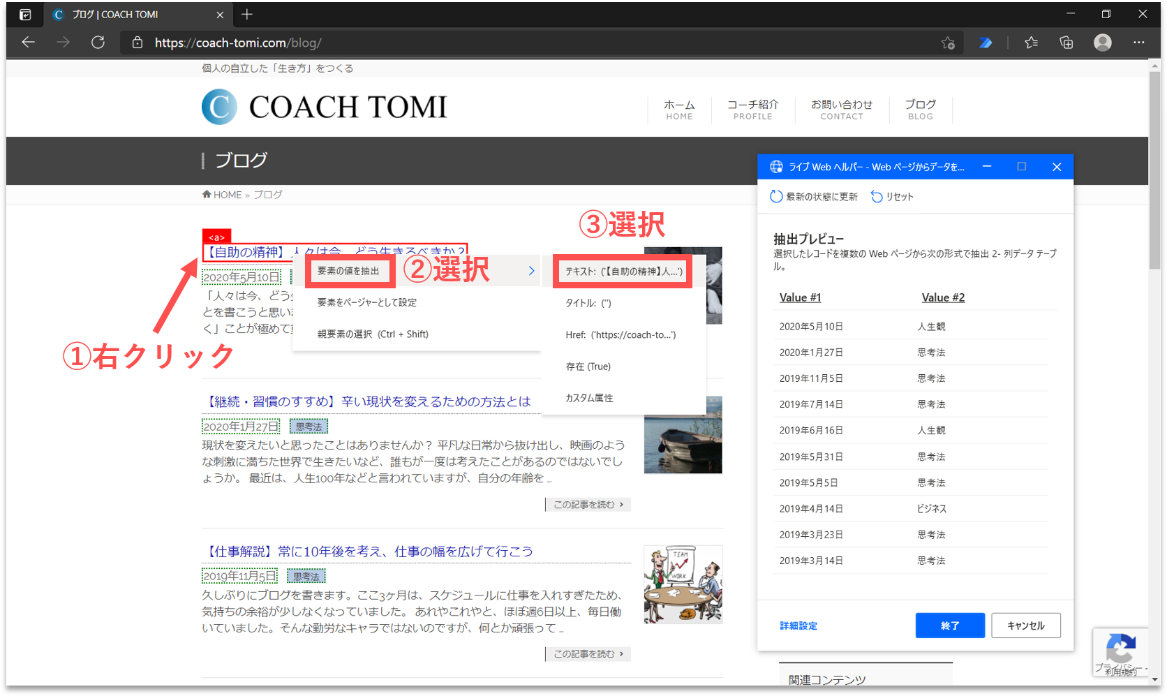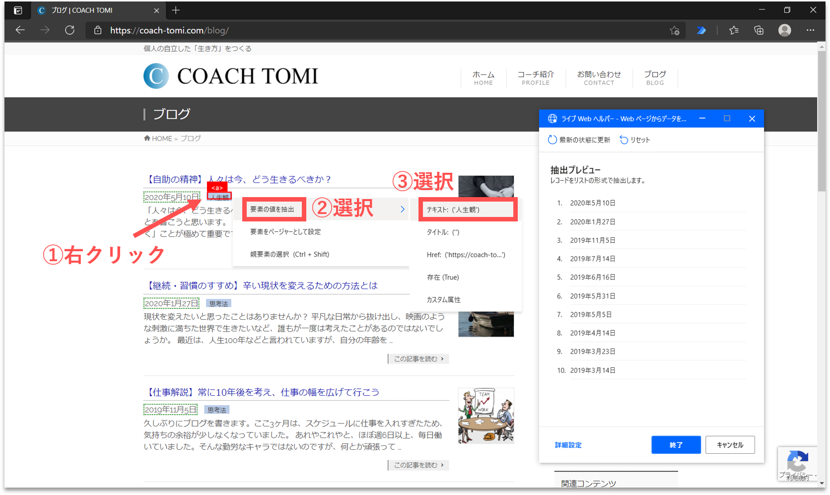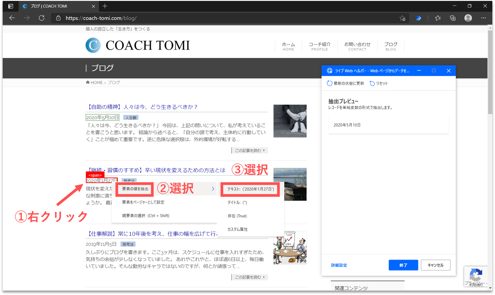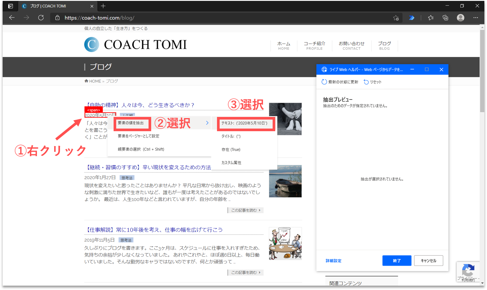 このプロパティ設定の画面が開いた状態で、Webブラウザ画面に表示を切り替えると、「ライブWebヘルパー」と呼ばれるパネルが出現します。先ずは、ブログ記事の「作成日」を取得します。画面内の一番目に表示されたブログ記事の作成日にカーソルを合わせて右クリックします。そして、「要素の値を抽出」を選択し、一覧の中から「テキスト:(’・・・’)」をクリックします。