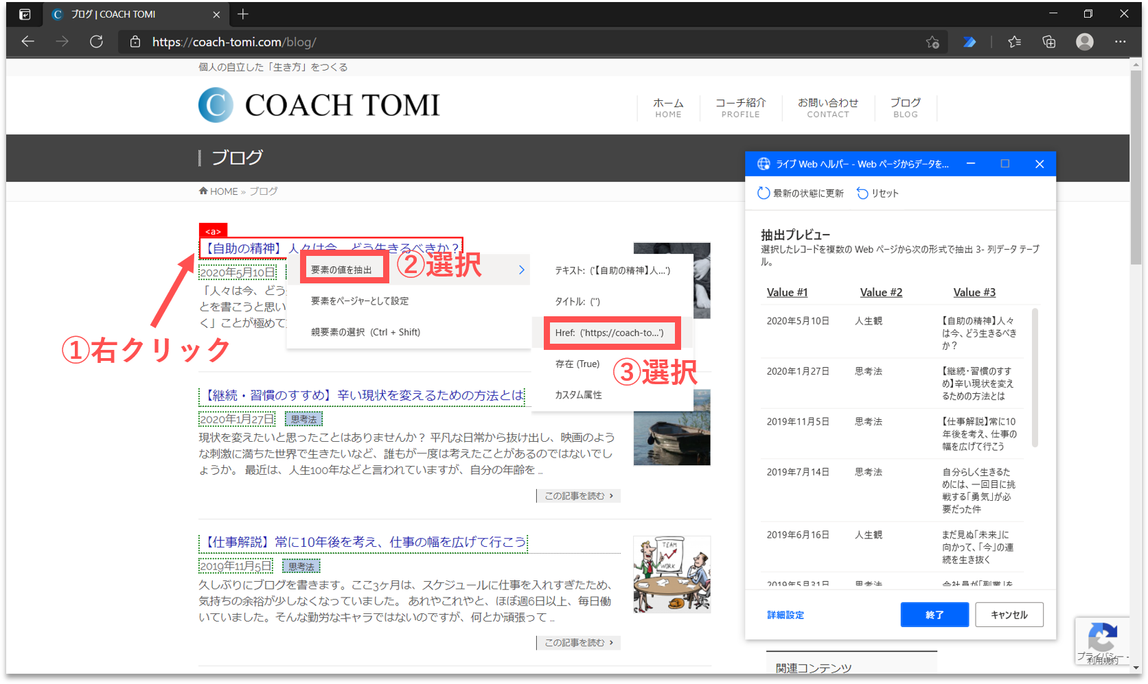 最後に、ブログ記事の「URL」を取得します。画面内の一番目に表示されたブログ記事の題名にカーソルを合わせて右クリックします。そして、「要素の値を抽出」を選択し、一覧の中から「Href:(’・・・’)」をクリックします。