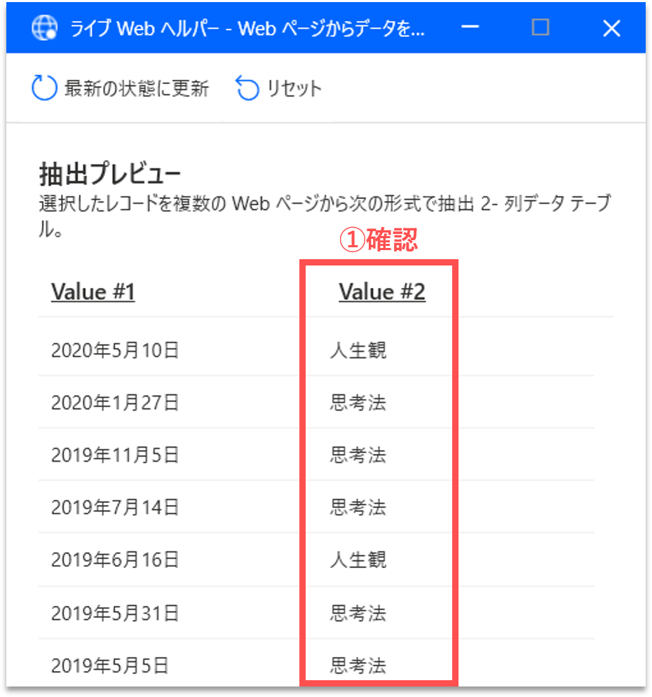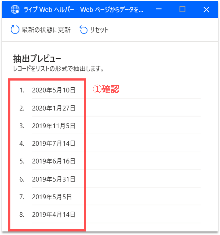 すると、「ライブWebヘルパー」パネルに、取得する構造化データのプレビューが表示されます。各ブログ記事の作成日のリストが表示されていることが確認できます。
