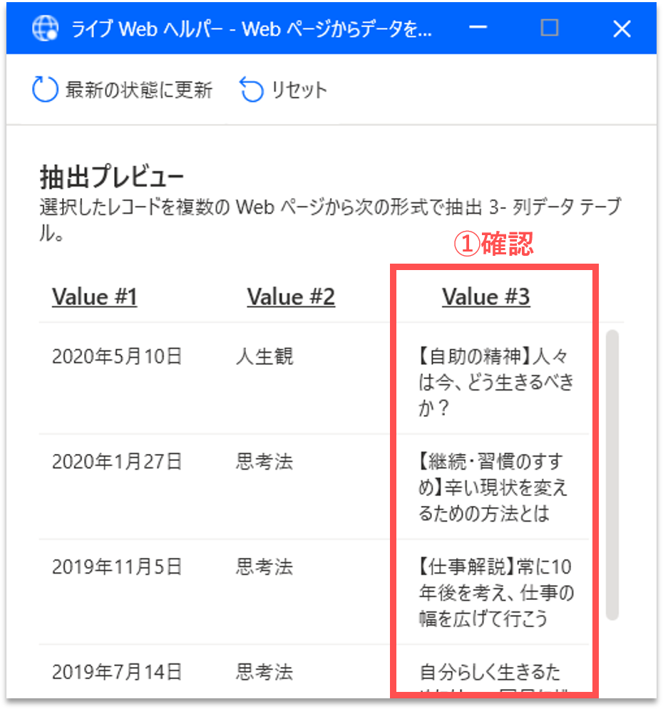 すると、「ライブWebヘルパー」パネルに、取得する構造化データのプレビューが表示されます。右端の列に題名のリストが追加されていることが確認できます。