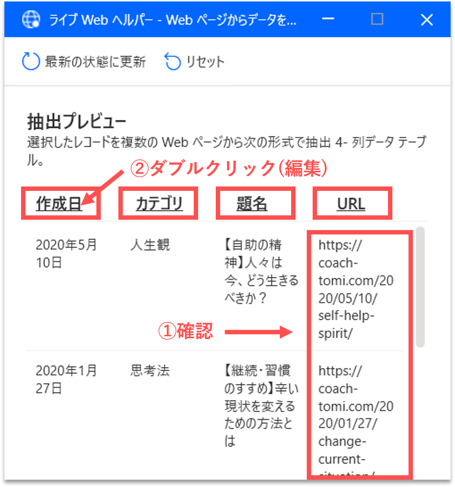 すると、「ライブWebヘルパー」パネルに、取得する構造化データのプレビューが表示されます。右端の列にURLのリストが追加されていることが確認できます。ここで、各列の項目名をダブルクリックして編集しておきましょう。これらはCSVファイルに出力する際の項目名となります。