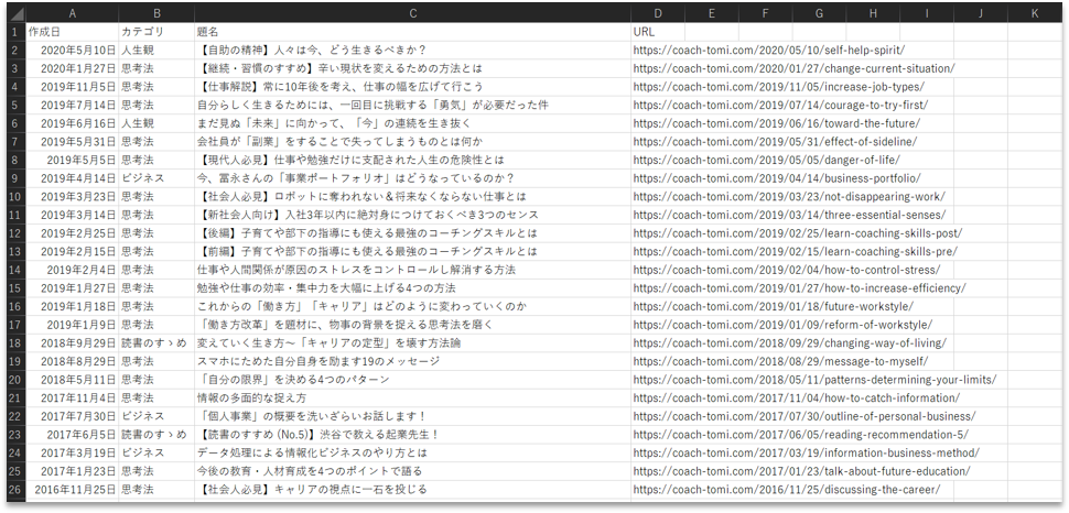 如何でしょうか。Webブラウザが起動して、ブログ記事の一覧画面をページ送りしていったと思います。そして、取得した構造化データのCSVファイルが、指定した保存場所に作成されました。上手く、Webサイトからブログ記事の見出し情報を取得することができています。