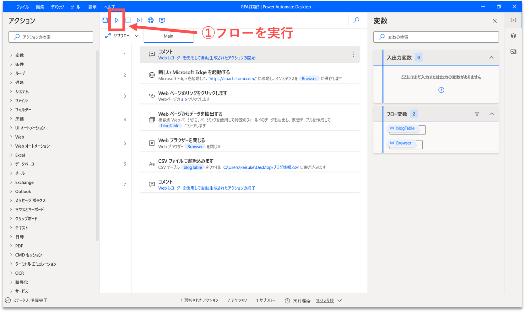 上部の「実行」アイコンをクリックし、このフローを実行してみましょう。なお、フローの作成画面から実行すると、「デバッグモード」で実行されるようで、処理速度が遅いです。実際の運用時には、管理画面から実行ボタンをクリックしてフローを実行しましょう。