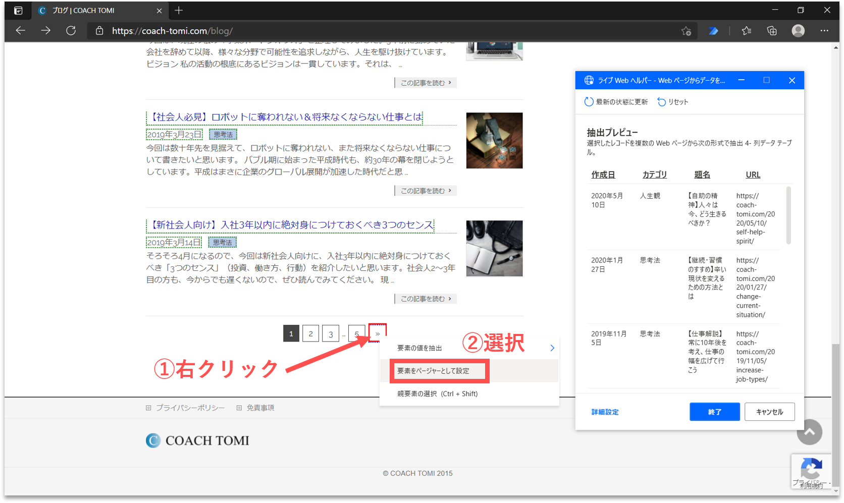 ページが複数にまたがる場合は、自動でページ送りするように設定する必要があります。事前に画面を一番下までスクロールして、ページ送りするリンクボタンを表示させます。そして、次のページに遷移するリンク(「次へ」、「Next」、「>>」など)を右クリックし、「要素をページャーとして設定」を選択します。