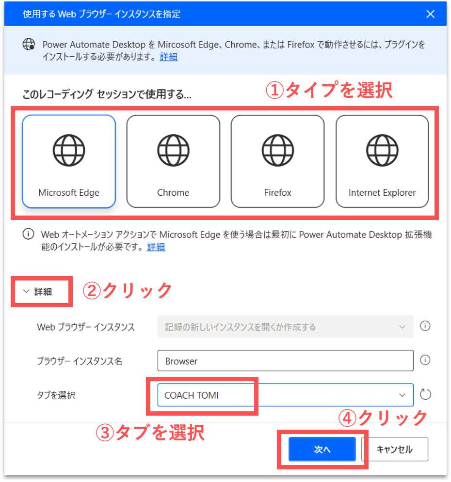 パネルが起動します。ブラウザのタイプを指定して、「詳細」エリアを開きます。「タブを選択」で、【Step.1】で開いた練習用のWebサイトを選択します。そして、「次へ」ボタンをクリックします。