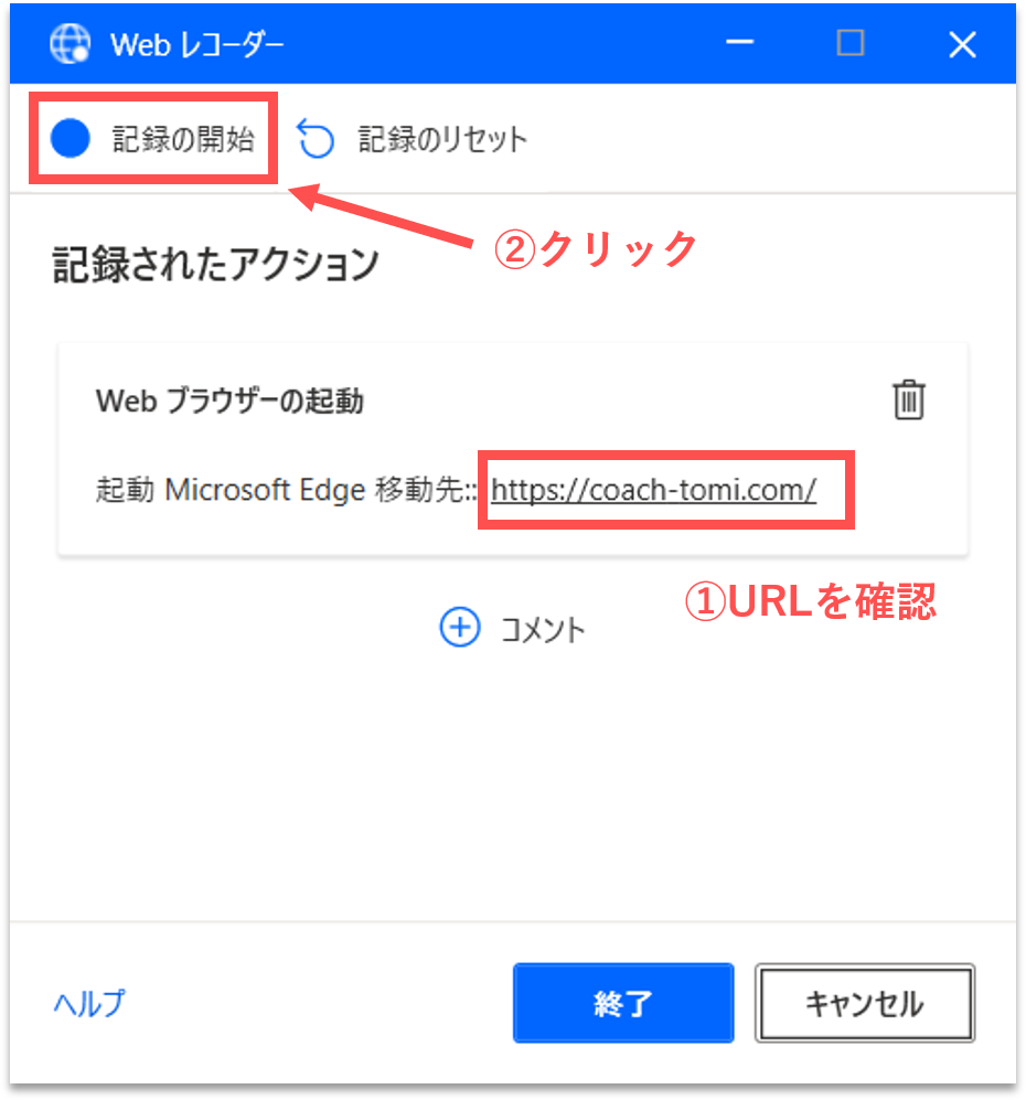 「Webレコーダー」パネルが起動します。一番初めに開くWebサイトのURLが設定されていることが確認できます。ここから、Webブラウザの操作を自動記録していきます。操作内容がそのまま記録されるので慎重に実行してください。では、「記録の開始」をクリックします。