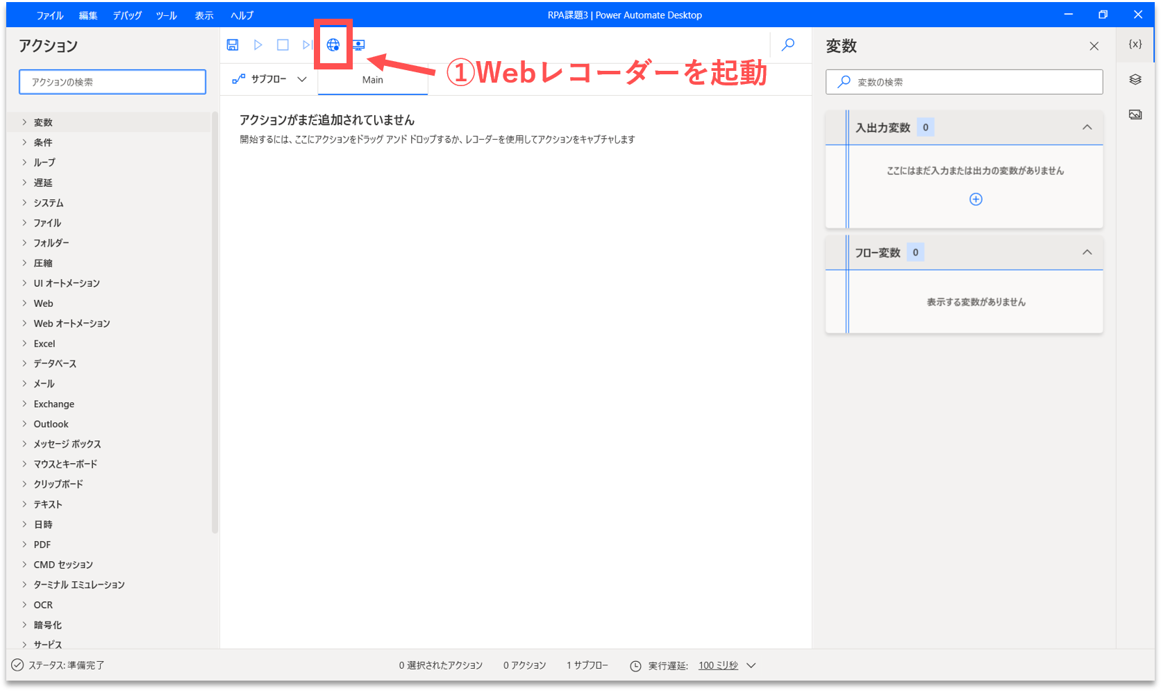 Webブラウザの操作を自動記録させるために、Webレコーダーを起動させます。上部の「Webレコーダー」アイコンをクリックします。