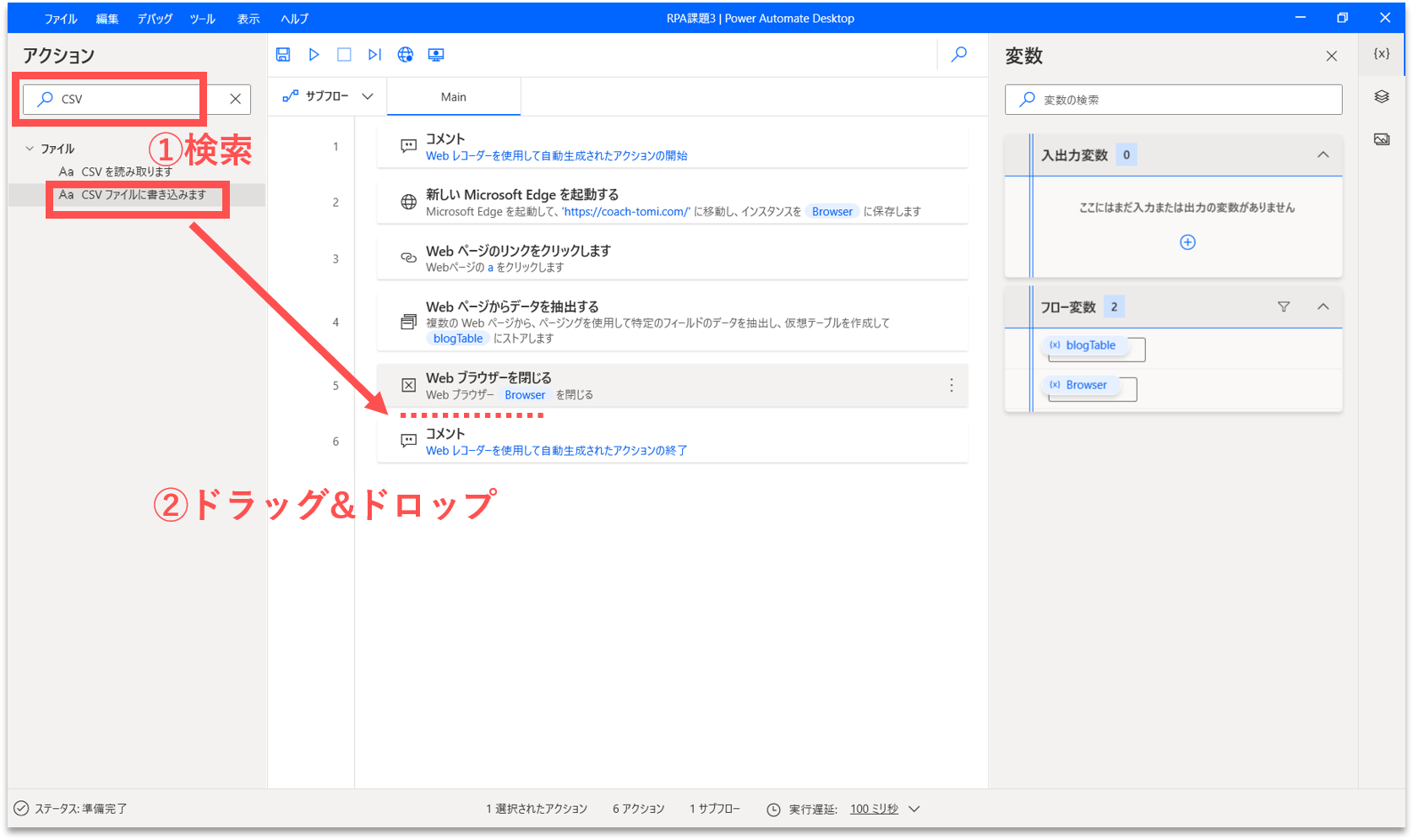 フローの最後に、CSVファイルに構造化データを出力する処理を追加します。画面左側のアクション検索窓に「CSV」と入力します。「CSVファイルに書き込みます」アクションを、フロー内の「Webブラウザを閉じる」アクションの直下にドラッグ&ドロップします。