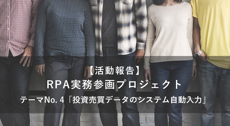 RPA実務参画プロジェクト・テーマNo.4「投資売買データのシステム自動入力」が完了しましたので、活動内容を報告いたします。 1. プロジェクト概要 プロジェク…